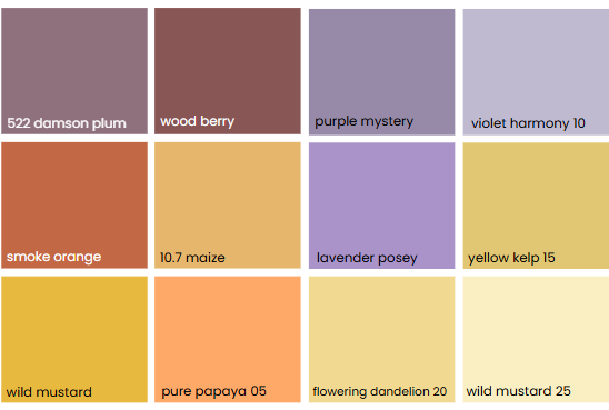 Alle verfügbaren Violett-, Orange– und Gelbtöne im Überblick