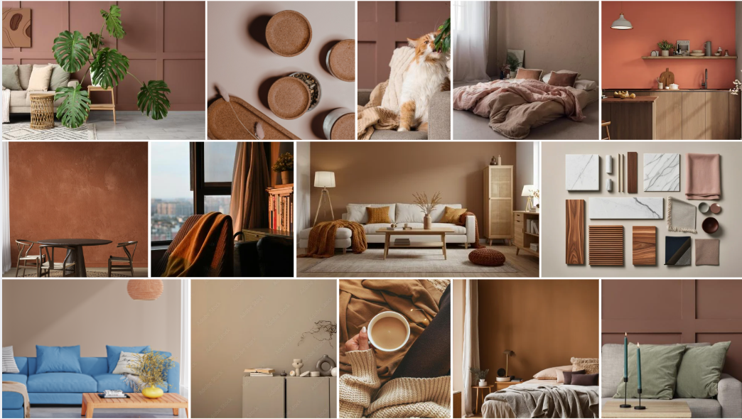 Erdtöne – In Kombination mit natürlichen Materialien wie Holz in warmen, satten Nuancen entfalten Braunnuancen ihre volle Wirkung und verleihen Räumen Tiefe und Authentizität. Ergänzt durch Erdtöne wie Ocker und Terrakotta entsteht eine ruhige, harmonische Atmosphäre mit natürlicher Ausstrahlung.